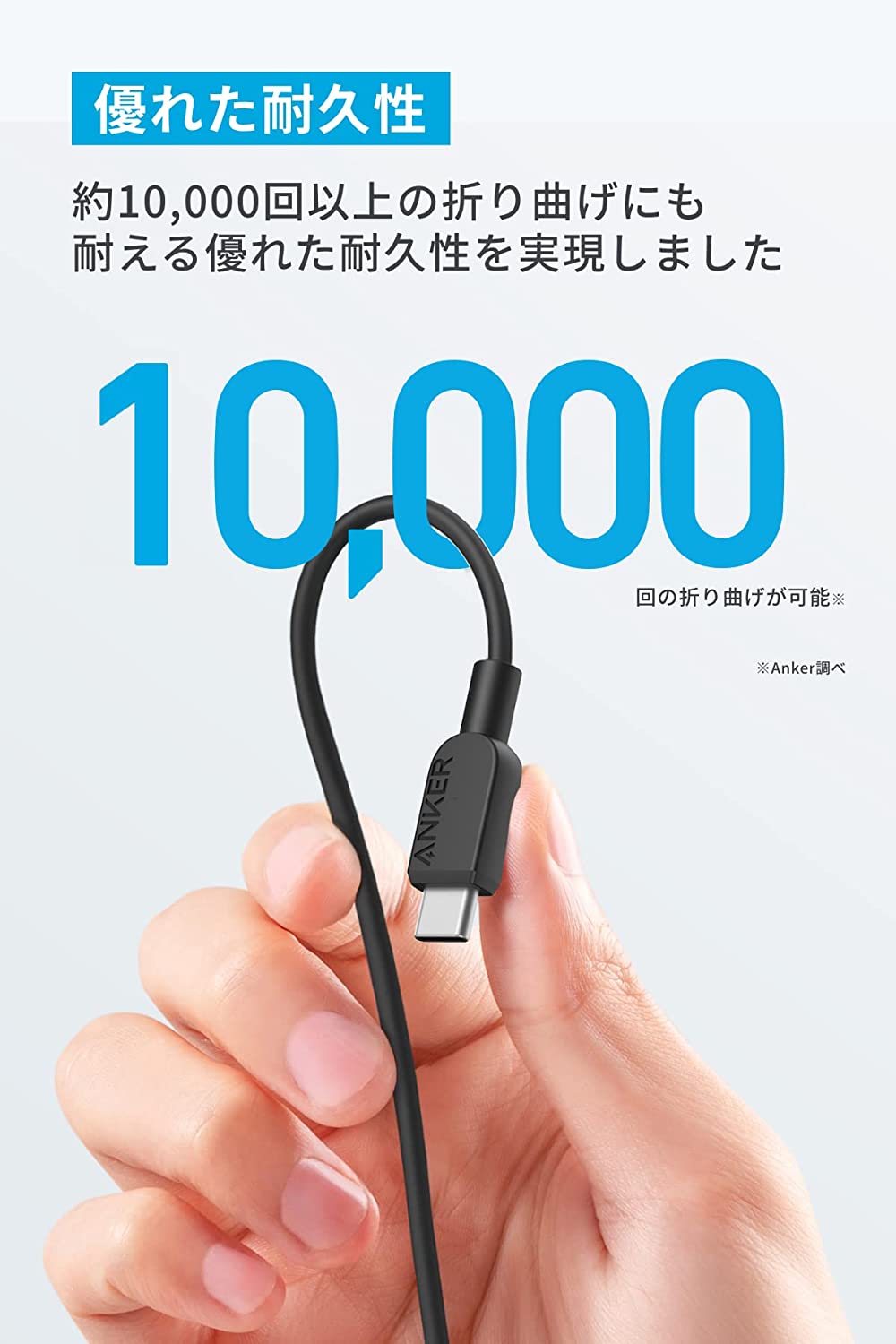 10,000回以上の折り曲げにも耐える優れた耐久性を実現しているため、ケーブル内部のワイヤーを断線から保護し、安心して充電することができます。