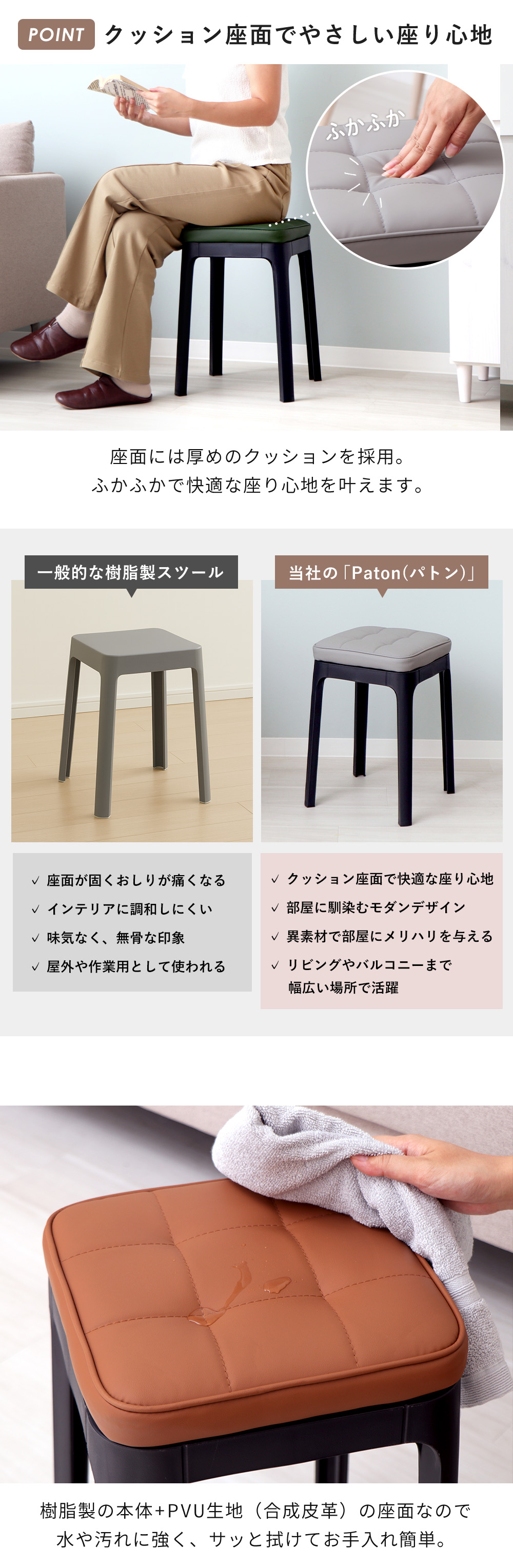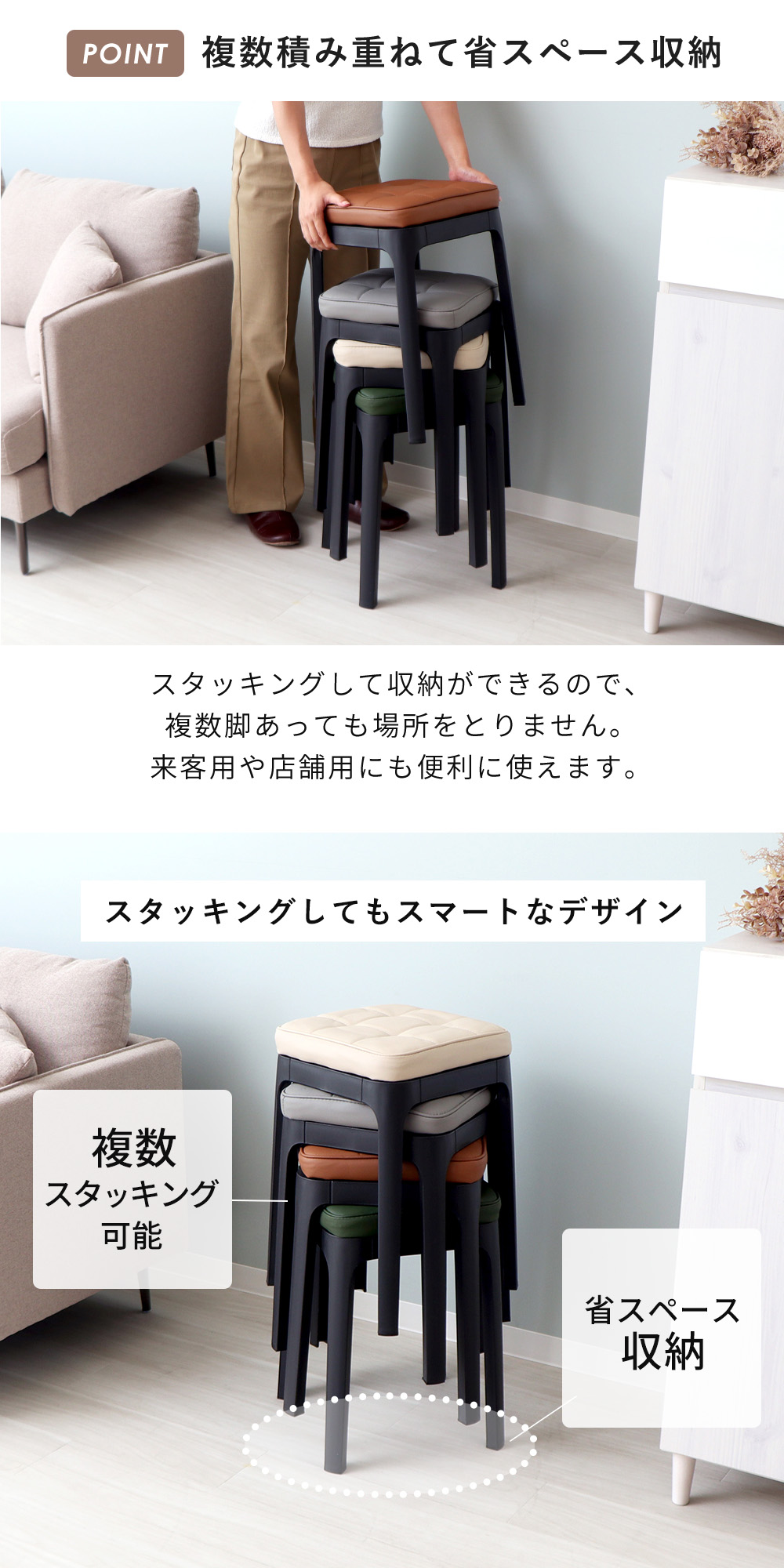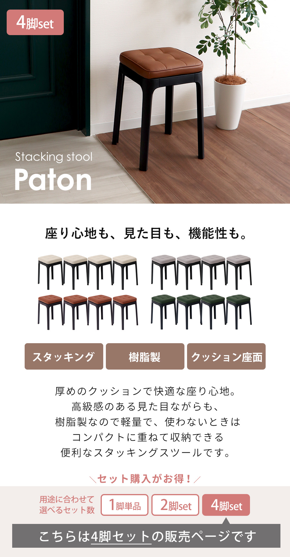 スツール 収納 椅子 スタッキング 4脚 セット チェア イス 四角 玄関 ダイニング キッチン リビング 軽量 クッション 北欧 パトン Paton