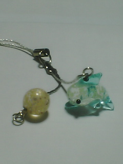 蓄光ガラス 携帯ストラップ イルカ&ピンクの蓄光ビーズ
