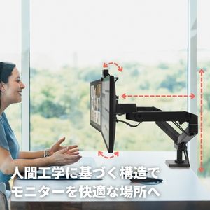 可動域が広く、モニターの位置、角度、高さの調節が軽い力で自由自在。快適な目線と姿勢で疲れを軽減します。