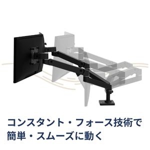 ・モニターの位置、角度、高さの調整が軽い力で自由自在。好きなところでピタッと止まります。・耐久性に優れ10年保証です。・横並びにぴったりなデュアルモニターアームです。モニターはそれぞれ動かせます。・豊富なアクセサリで3画面、4画面に変更可能です。・台座の回転を180°と360°に変更できます。・従来のLXより軽いモニターを設置できます。27インチまで、1モニター1.8kgから9kgまで/総重量3.6kgから18.1kgまでのモニターに対応、VESA 100x100mm、75x75mm。・ケーブルがまとまり、外観もスマートに。・従来のLXより部品が少なくモニターの取り付けも簡単になりました。・前後伸縮約65cm、昇降33cm、モニターの縦横回転360°、アーム部分の回転360°、製品本体重量約6.2kg。◆ご注意(免責)>取扱説明書をお読みの上、正しくお使いください。モニターを取り付けてから各部の調整を行ってください。組み立て前の状態では各部の調整はできません。グロメットマウントは別売 (98-728-292) です。◆製品ご購入後のお客様のサポート窓口japansupport@ergotron.com (日本語)ご使用中何かご不明点や不具合がございましたら、こちらのサポート窓口へお問い合わせください。