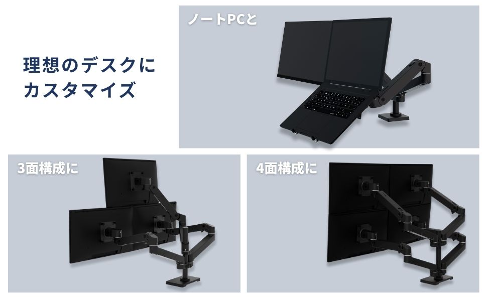 豊富なアクセサリでさまざまなカスタマイズが可能です。ベースを取り換えてアームを付け足すことで3画面、4画面などのマルチモニター構成が可能になります 。