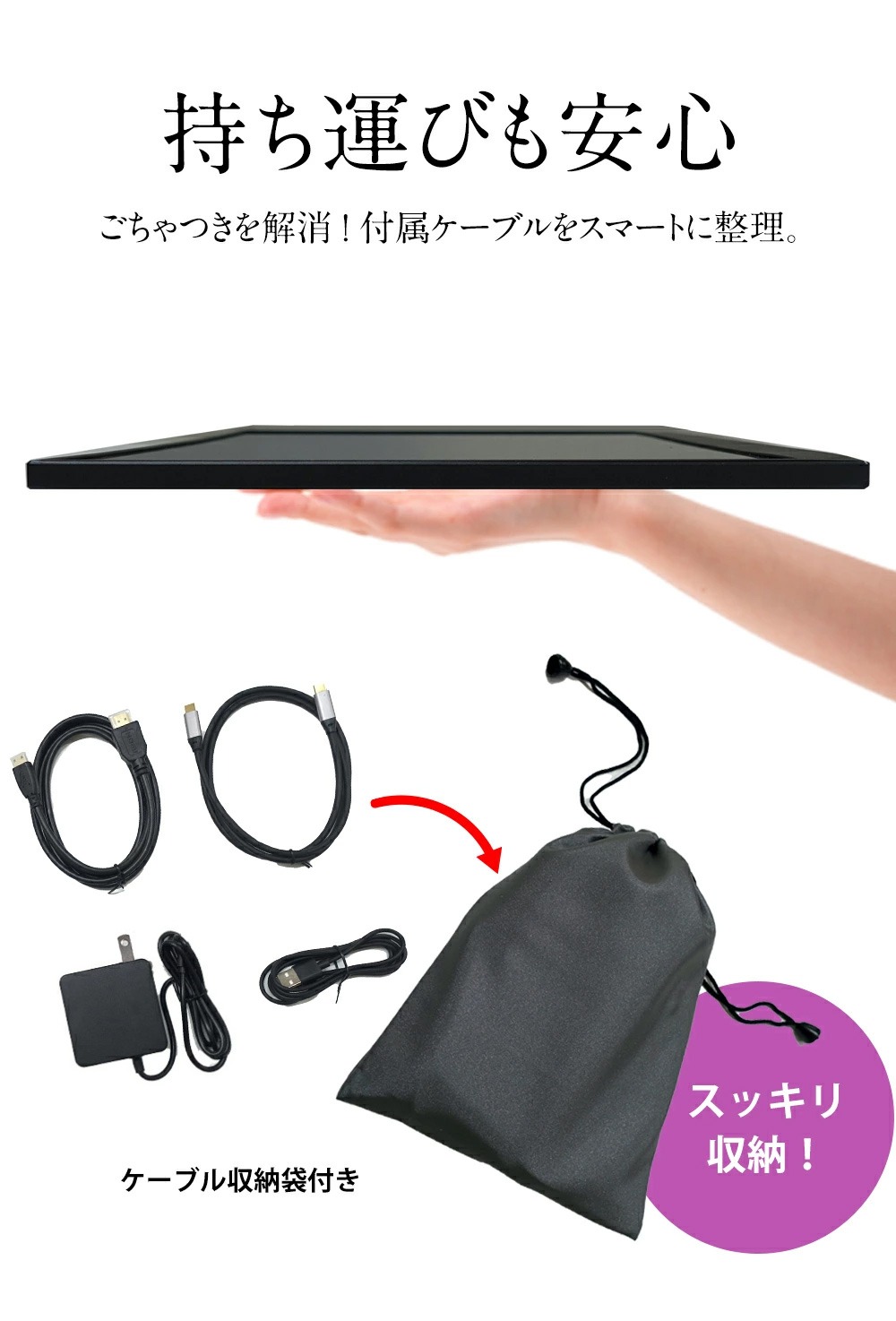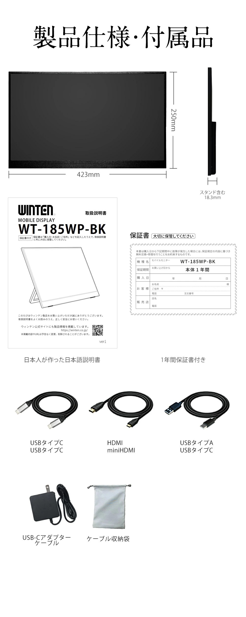■付属品:USBタイプCケーブル、USBタイプA-USBタイプCケーブル、HDMI-ミニHDMIケーブル、USBタイプCアダプターケーブル、ケーブル収納袋、取扱説明書(保証書付き)