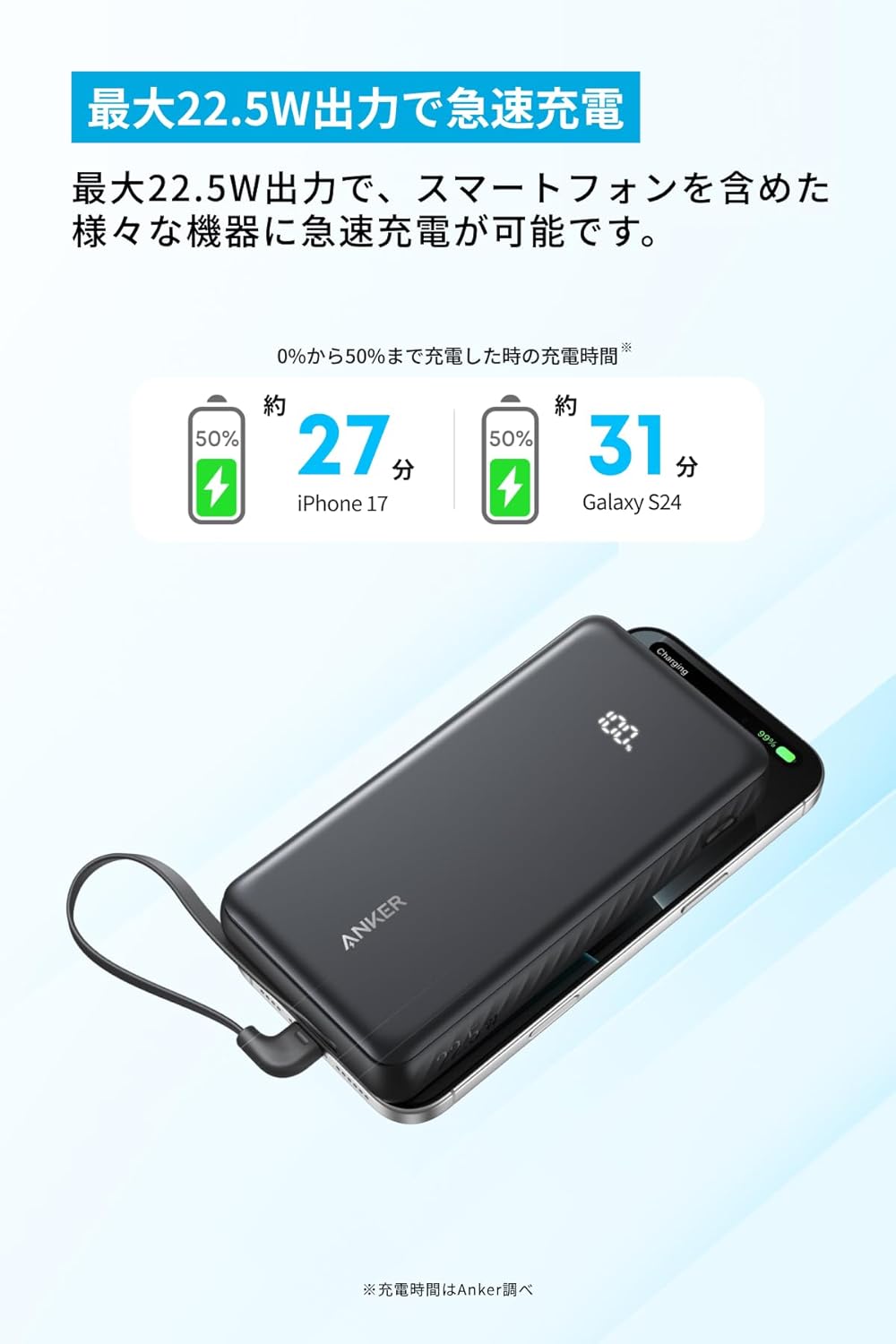 最大22.5W出力で、スマートフォンを含めた様々な機器に急速充電が可能です。