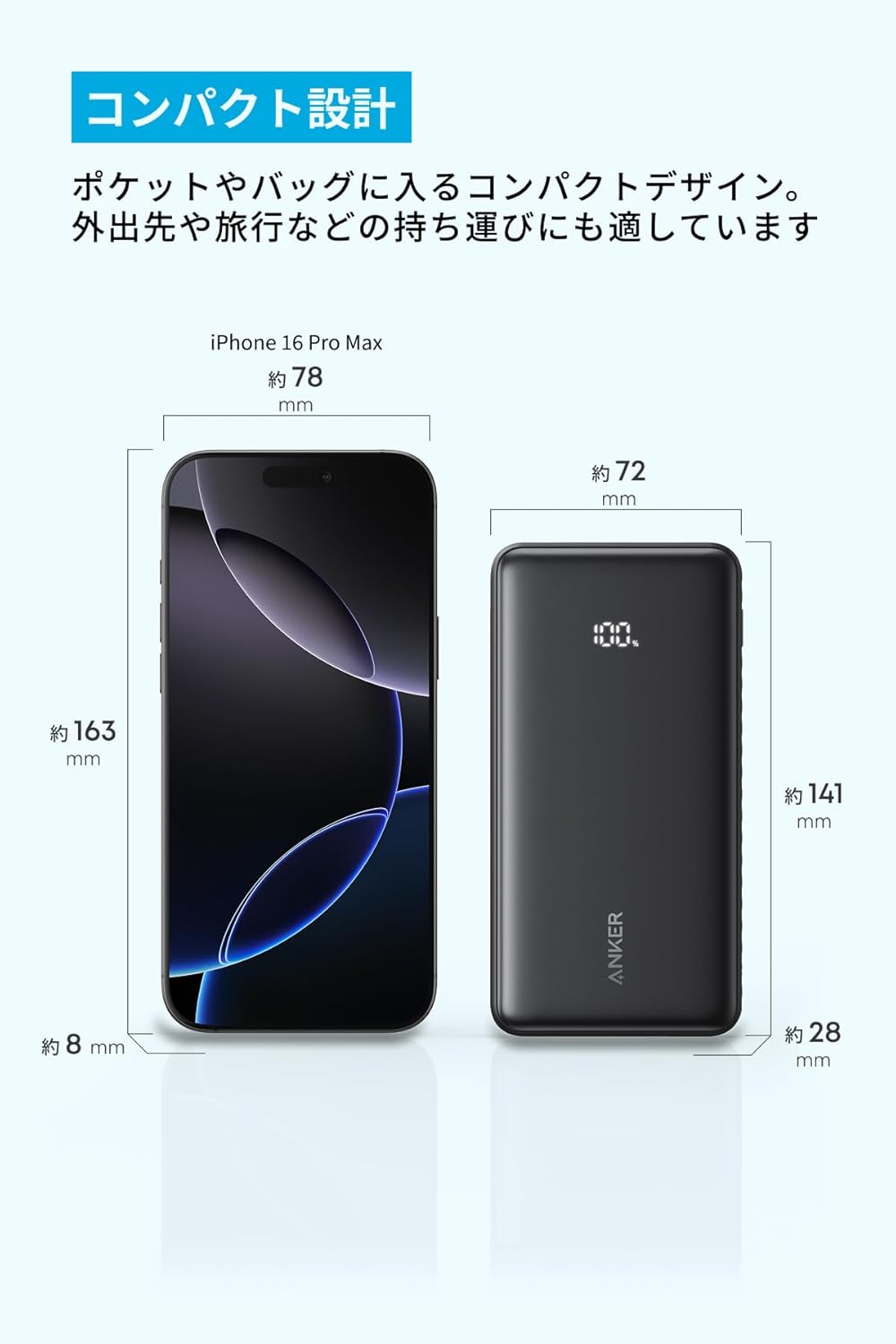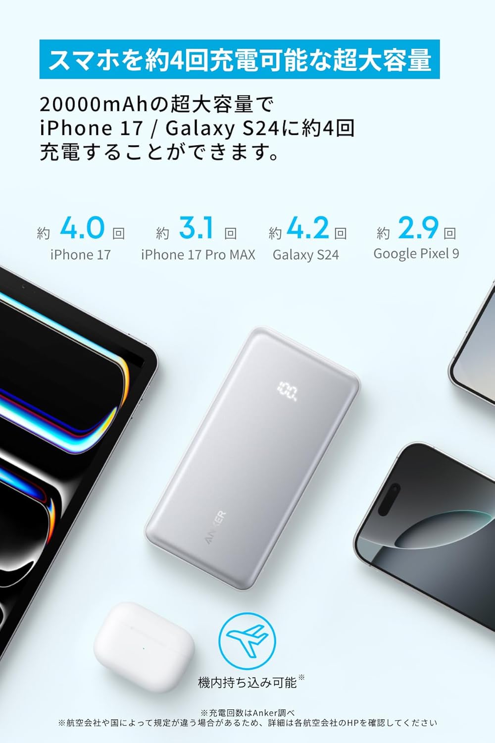 20000mAhの超大容量でiPhone 17 / Galaxy S24に約4回充電することができます。