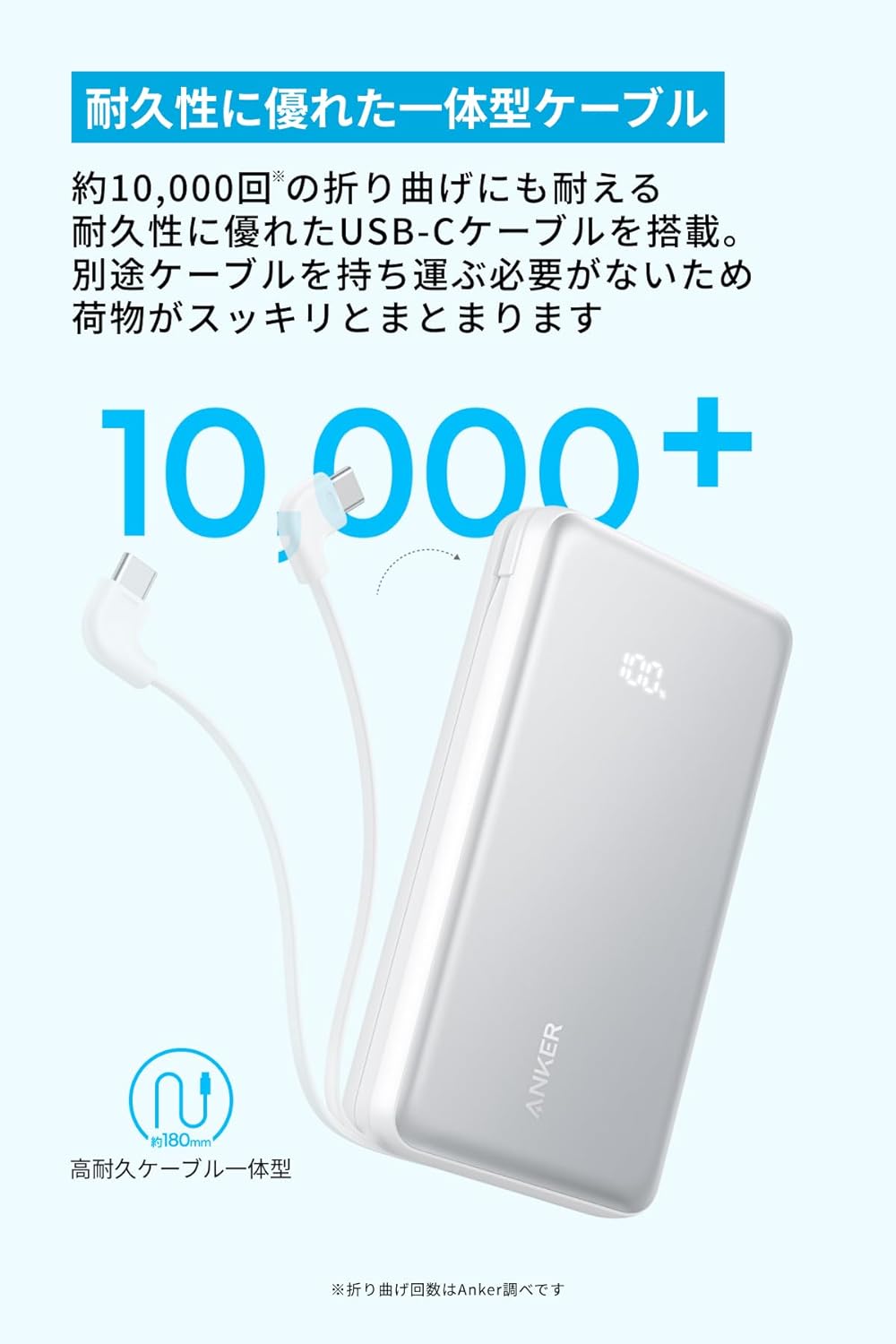 約10,000回の折り曲げ にも耐える耐久性に優れたUSB-Cケーブルを搭載。別途ケーブルを持ち運ぶ必要がないため、荷物がスッキリとまとまります。