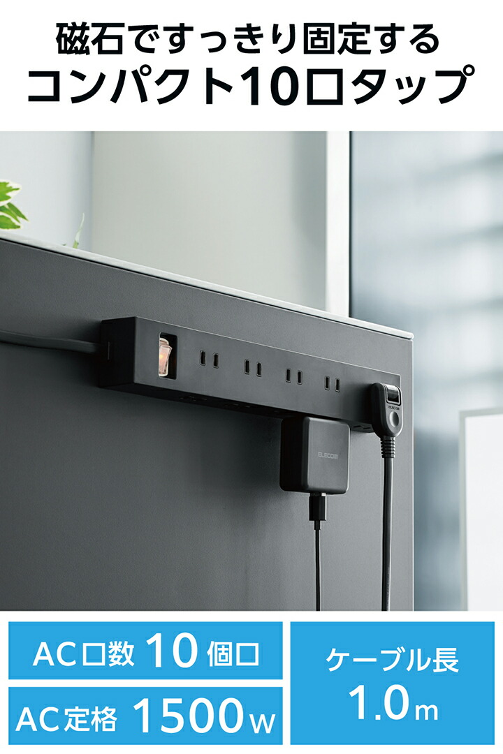 上面と側面にそれぞれ5個口ずつ、計10個口の2ピン式差込口を搭載したタップです。ON時に発光する一括スイッチで待機電力を抑え、底面の強力な磁石でスチール製の家具や事務機器などに吸着させて利用できます。