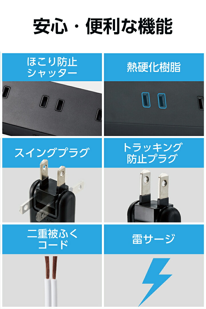 ●差込口には耐熱性に優れた熱硬化性樹脂を使用しており、万が一の発熱の際にも融解しにくく、電気火災の防止に有効です。