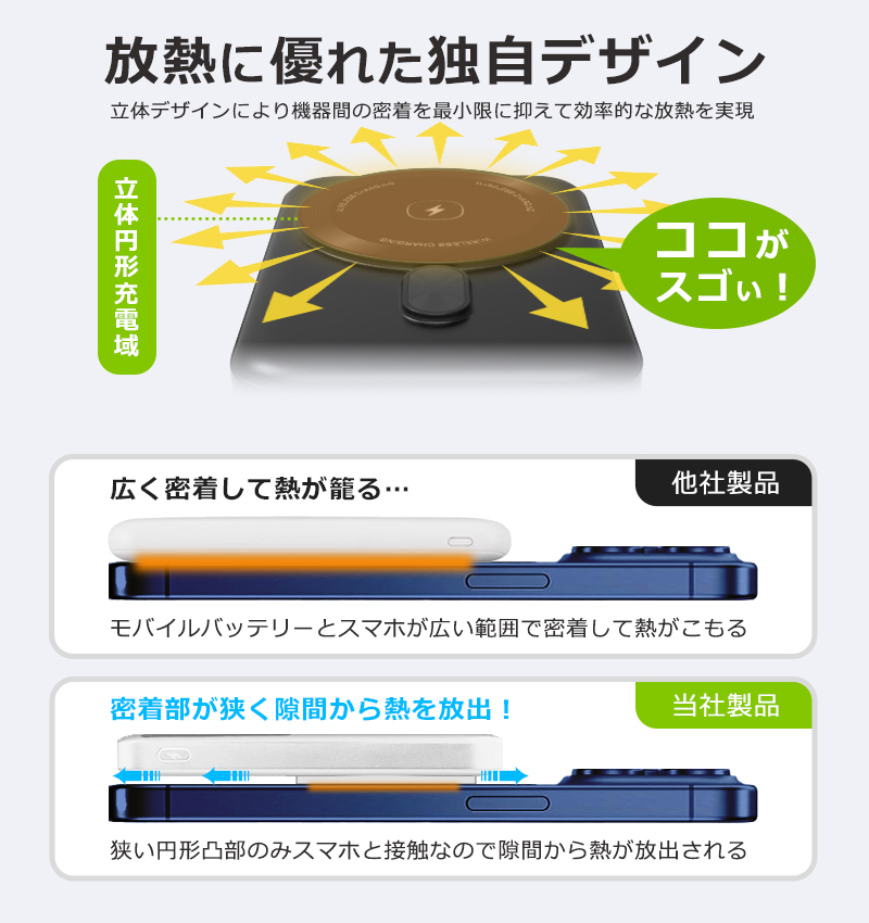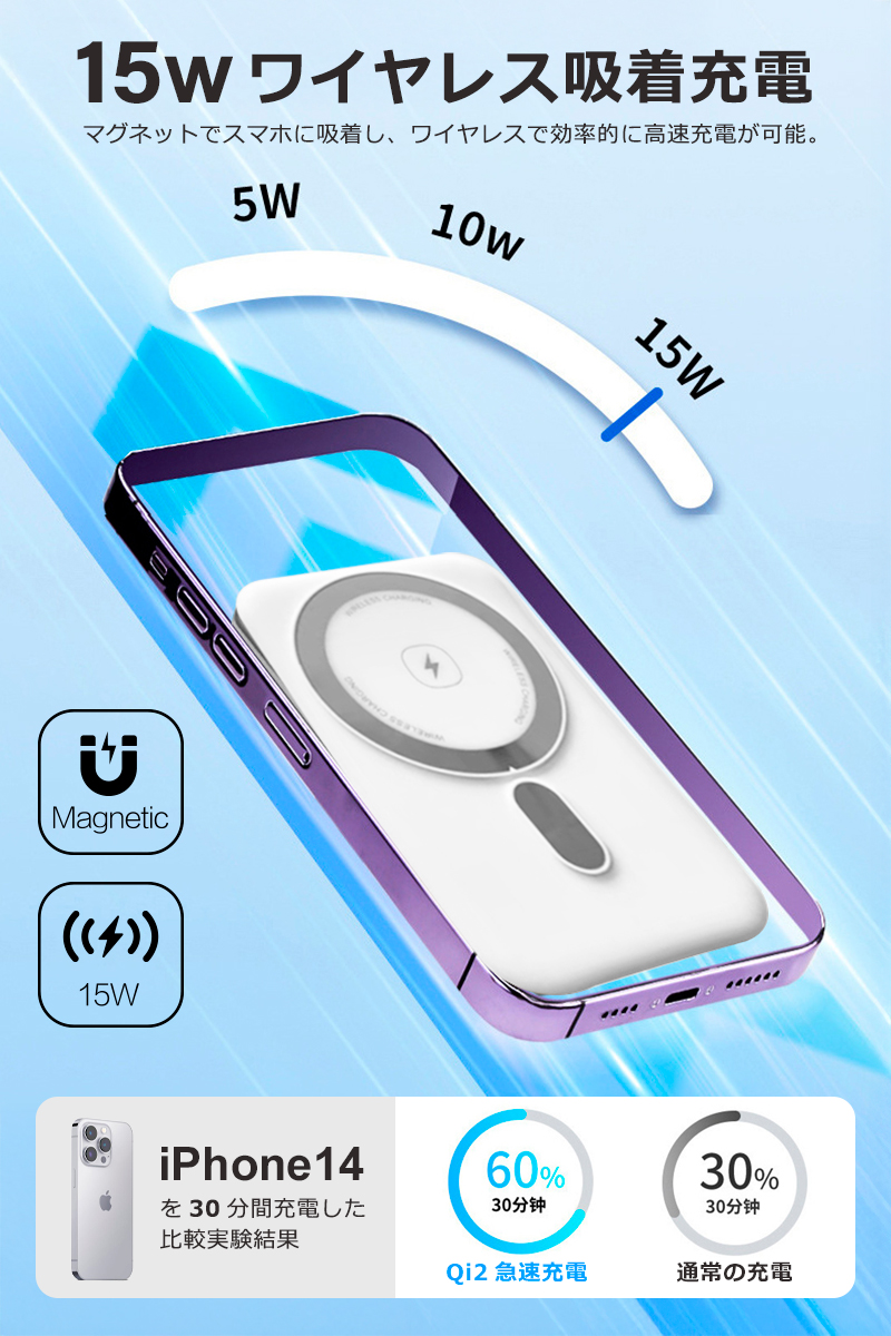 マグネットでスマートフォンに磁力吸着し、ワイヤレスでより効率的で高速な充電。