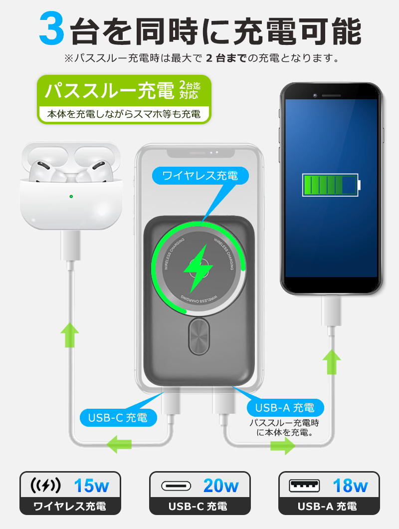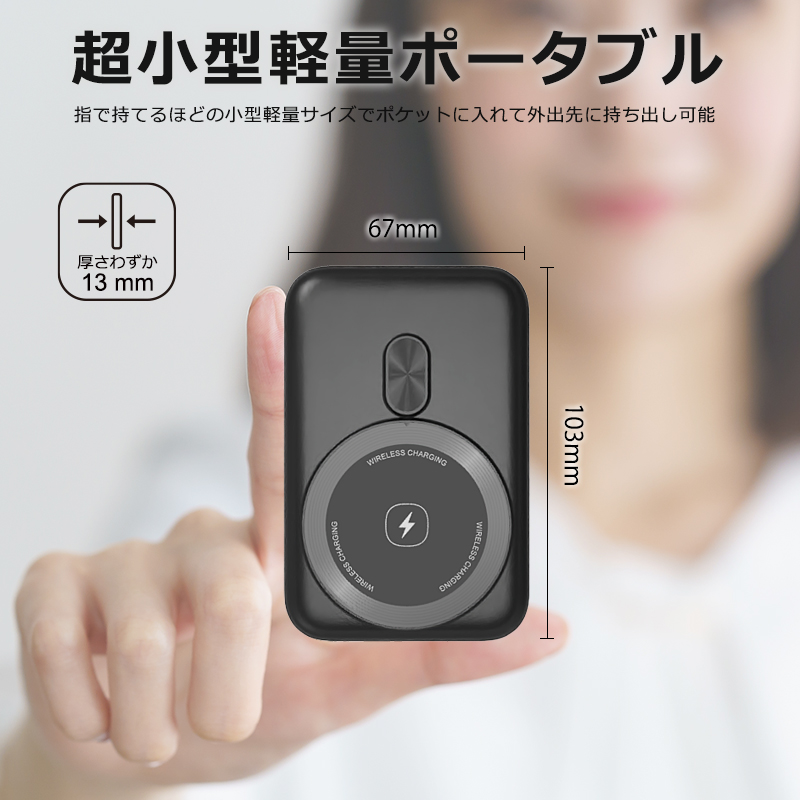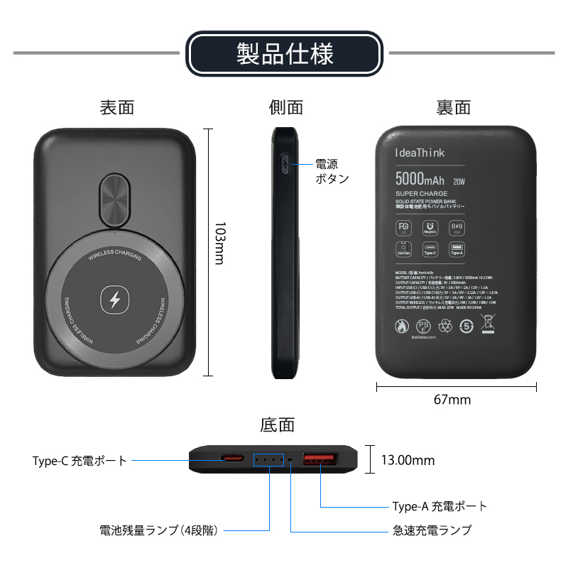5000mAhワイヤレス、USB-C/A三対応準固体大容量モバイルバッテリー