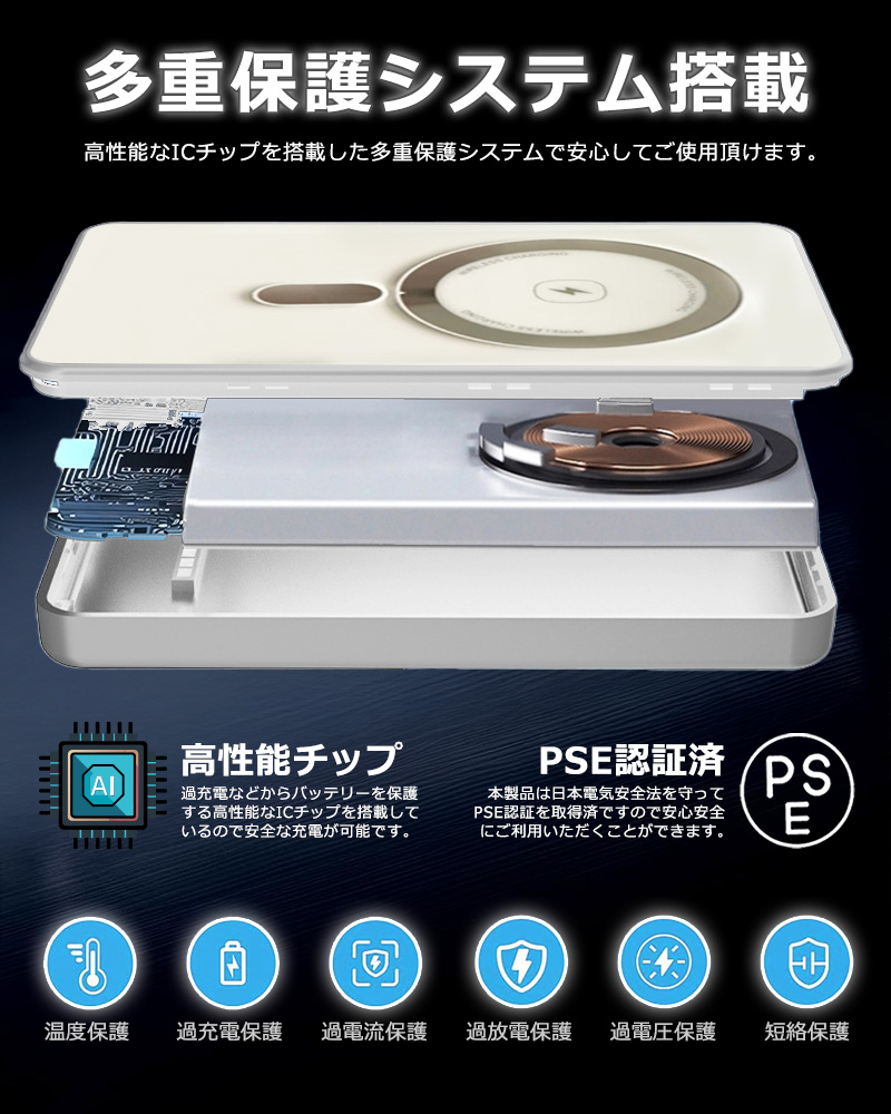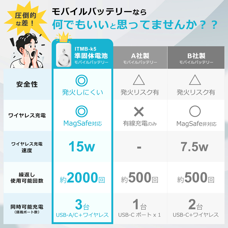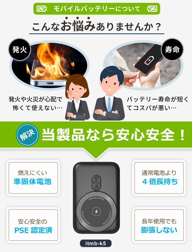 燃えない 安全 準固体 モバイルバッテリー 4倍長寿命 ワイヤレス
