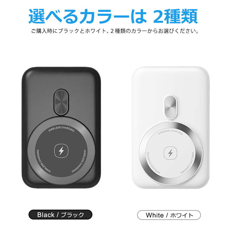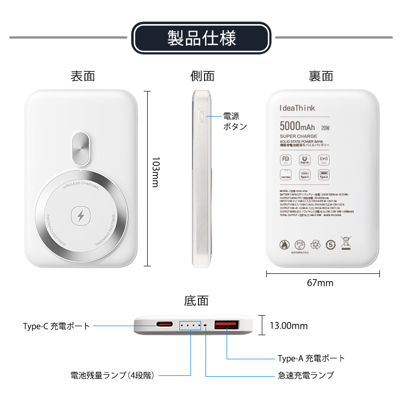電池:準固体電池バッテリー容量:5000mAh搭載ポート:USB-Ax1/USB-Cx1USB-C 入力:5V=3A、9V=2A、12V=1.5AUSB-C 出力:5V=3A、9V=2.22A、12V=1.67AUSB-A 出力:5V=3A、9V=2A、12V=1.5Aワイヤレス出力:5W / 7.5W / 10W / 15W本体サイズ:103mm x67mm x 14mm/ 126gカラー:ホワイト / ブラックセット内容 :・モバイルバッテリー本体・USB-C 充電ケーブル・円形接着シール・取扱説明書・キャリングポーチ