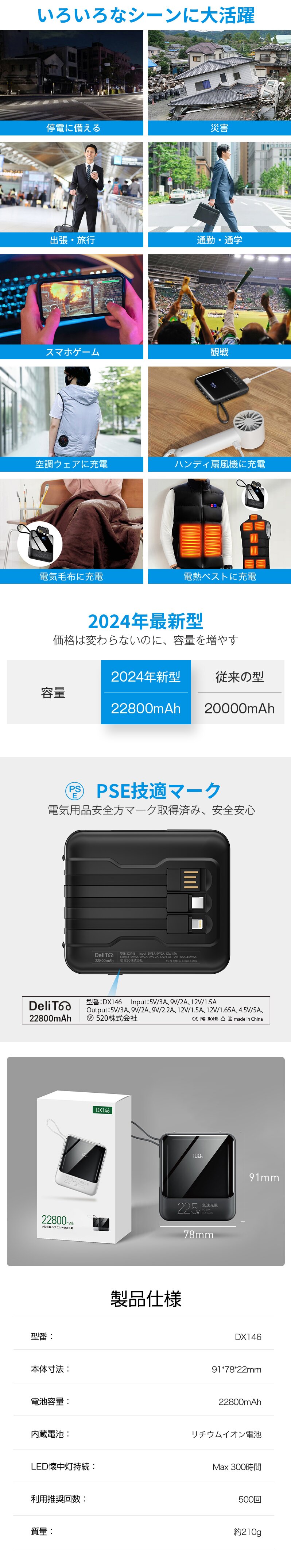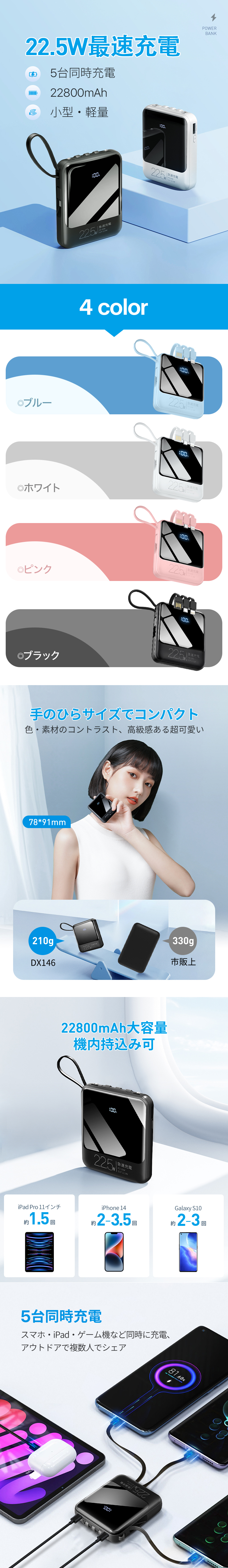モバイルバッテリー 軽量 小型 22800mAh バッテリー 22.5W 急速充電 ケーブル内蔵 携帯充電器 SCP 22.5W/PD 20W 機内持込 防災