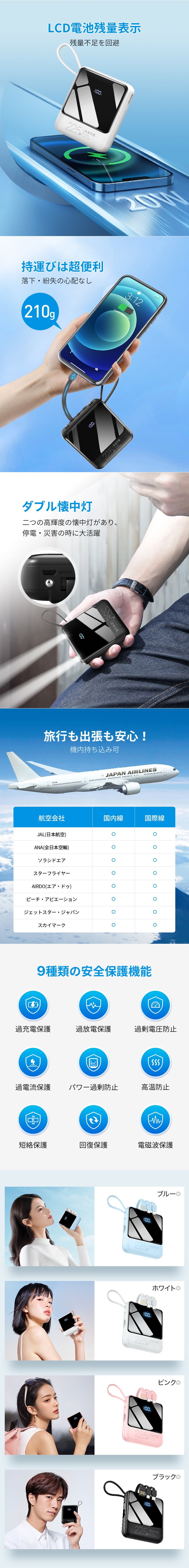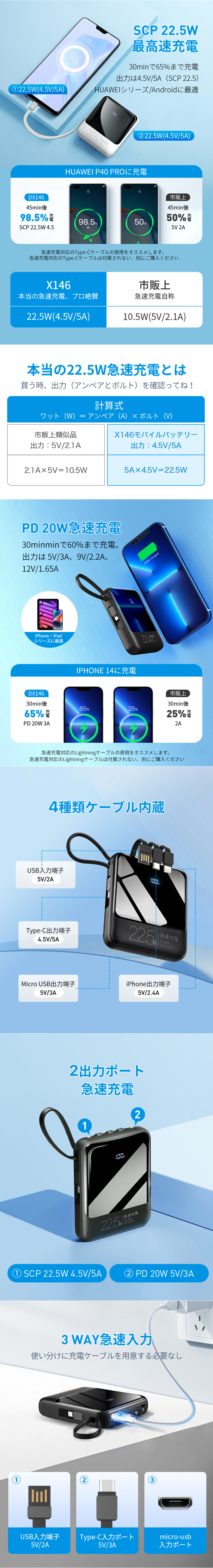 内蔵ケーブル:Type-C出力ケーブル(PD20W/SCP22.5W)、microUSB出力ケーブル(5V2A)、lightning用出力ケーブル(5V2.4A)、USB-A入力ケーブル(5V/2A)
