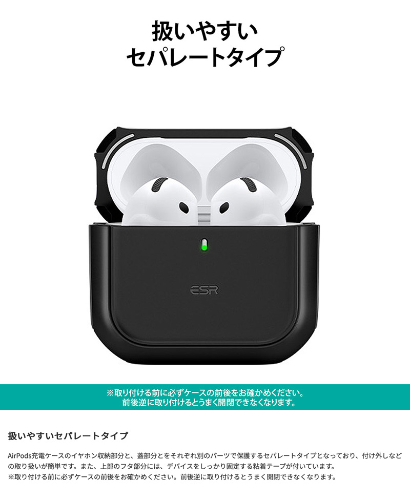 AirPods充電ケースのイヤホン収納部分と、蓋部分とをそれぞれ別のパーツで保護するセパレートタイプとなっており、付け外しなどの取り扱いが簡単です。また、上部のフタ部分には、デバイスをしっかり固定する粘着テープが付いています。