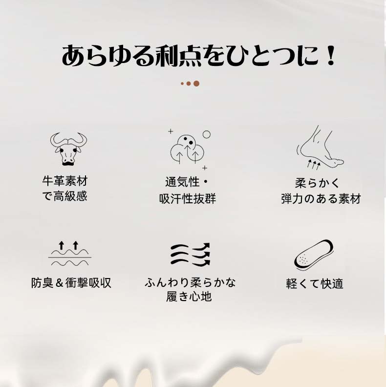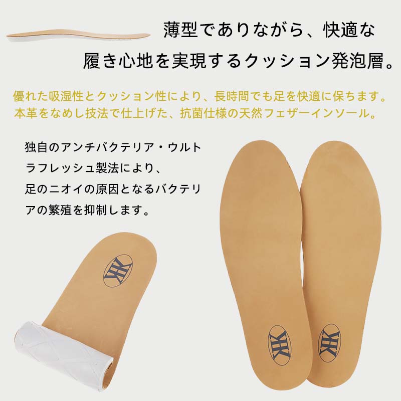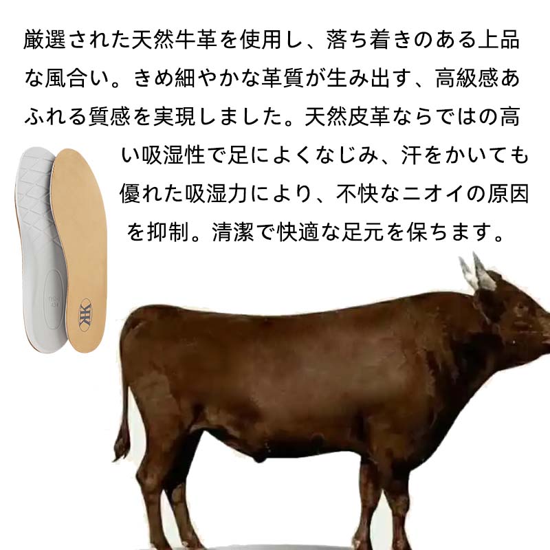 本革のインソールは、汗や湿気をしっかりと吸収し、蒸れを防ぎます。