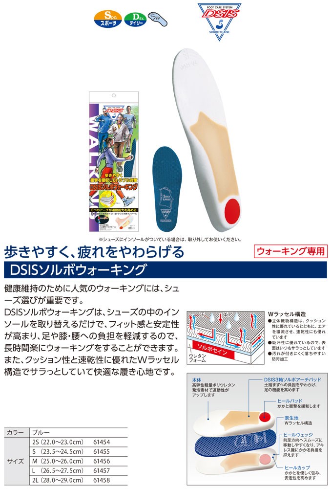DSISソルボウォーキングは、シューズの中のインソールを取り替えるだけでフィット感と安定性が高まり、足や膝・腰への負担を軽減するので