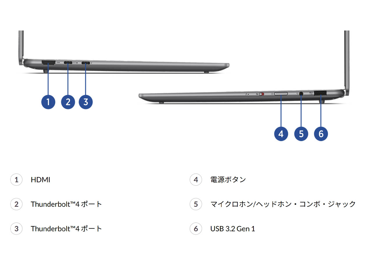 Thunderbolt™ 4 ポート×2(Powerdelivery対応、DisplayPort出力機能付き)、USBポート:Type-A:USB 3.2 Gen 1×1(Powered USB)、HDMI×1、マイクロホン/ヘッドホン・コンボ・ジャック×1